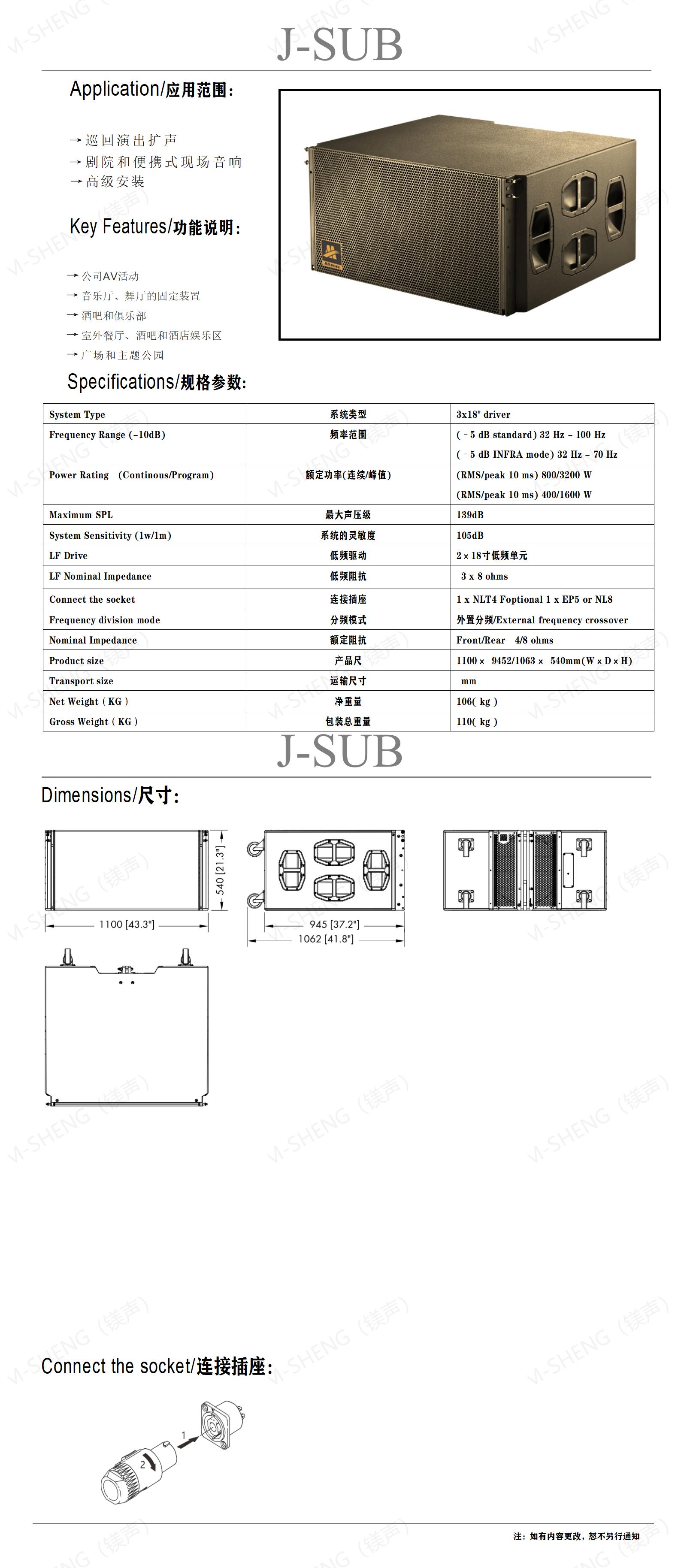 产品描述:J-SUB采用有源两分频驱动及低频反射式设计,内含三个 18” 长冲程的钕磁钢低频驱动单元,其中两个向前方辐射,一个向后方辐射
